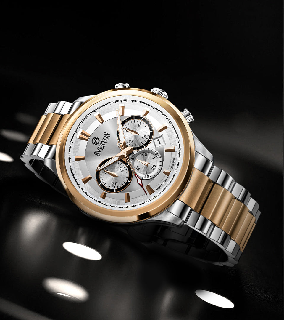 A refined three-counter men’s chronograph design with a layered dial built for clarity and performance. Sub-dials bring the mechanics to life, bold hour markers ground the look, and a clean date window adds everyday utility.