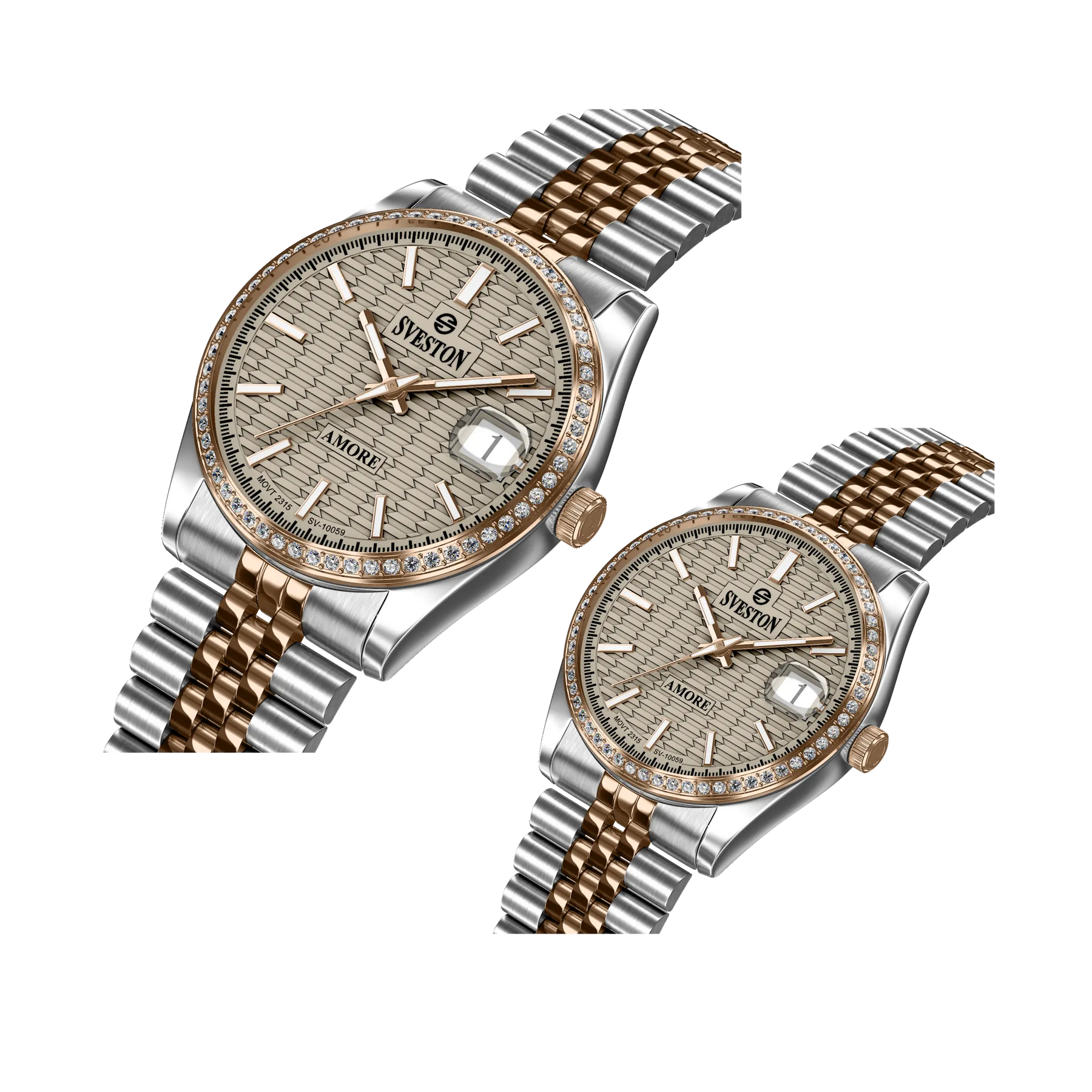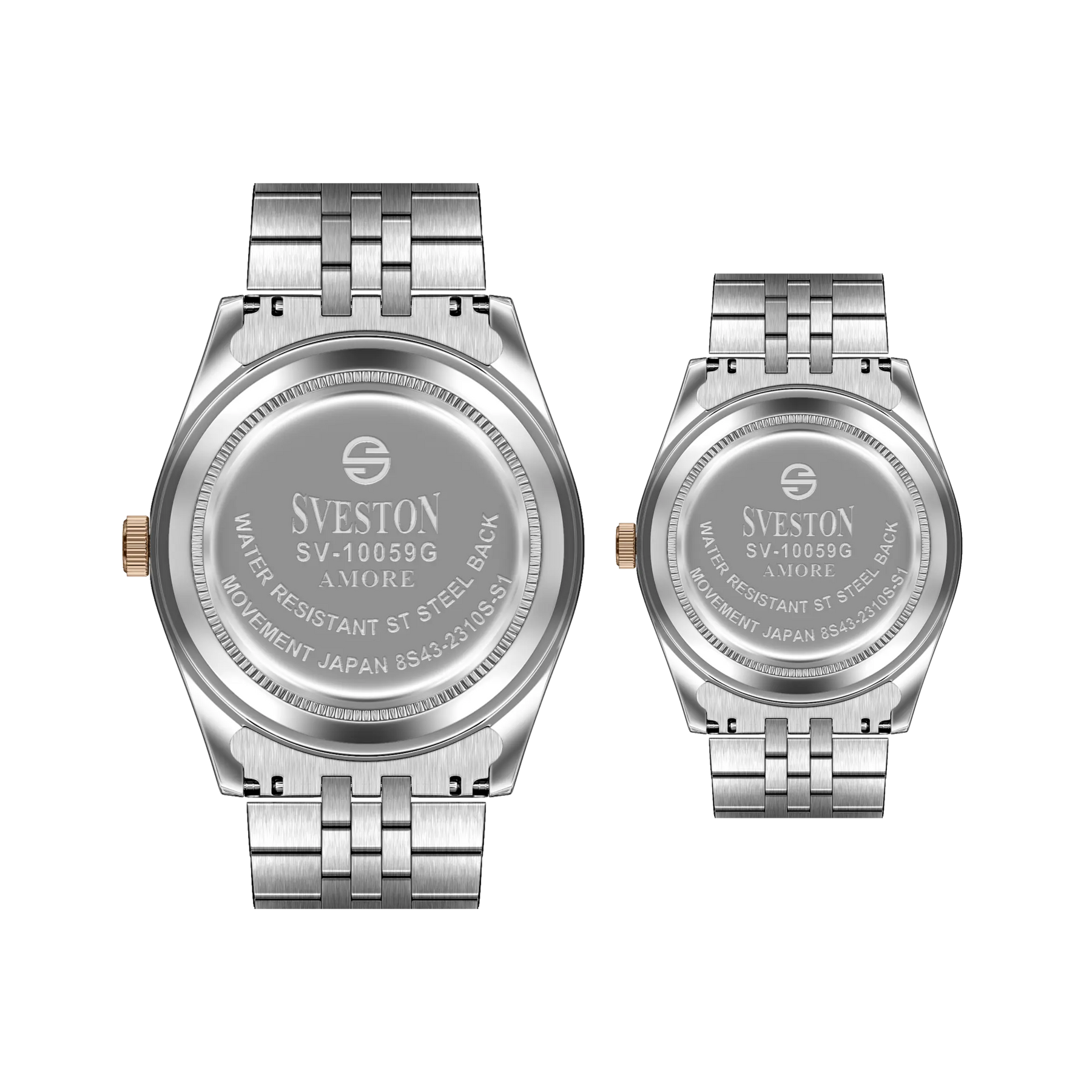 The Sveston Amore is a beautifully designed couple’s watch set featuring 35mm & 26mm cases, precise battery-powered 3-hand movement, a stainless steel link bracelet with push-button clasp, small seconds, date display, and comes with a luxury box and 1-year international warranty perfect for couples who love to match in style