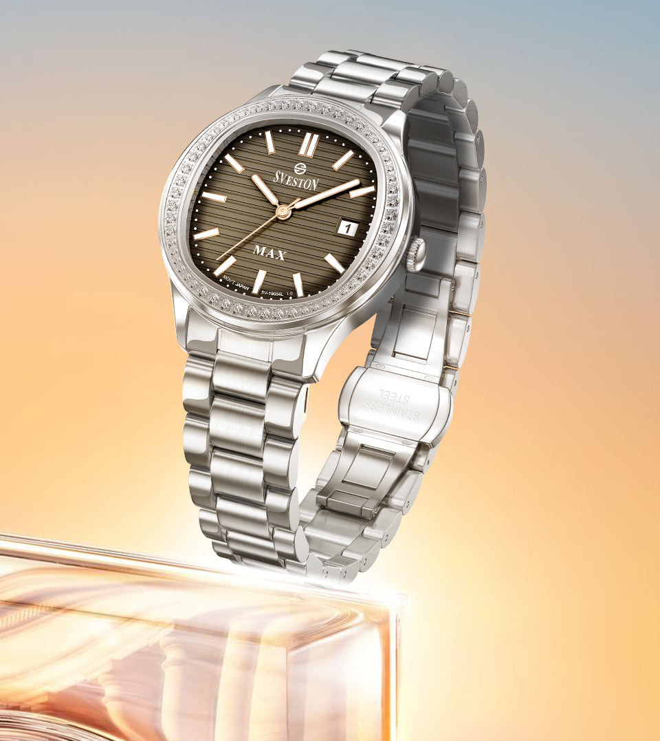 Sveston Max is a chic and modern stainless steel watch designed for women featuring a sleek 29mm dial and elegantly presented in a luxury watch case for a sophisticated touch
