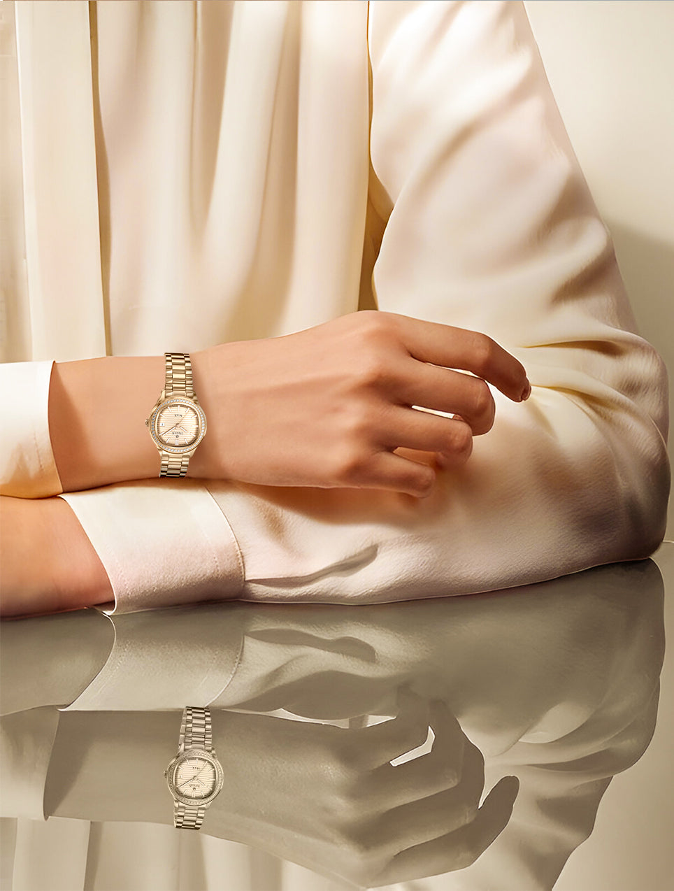 A 29mm round dial enriched with a subtle textured finish, set with slender dauphine-style hands, refined indices, and a discreet date window. Encircled by a polished bezel adorned with crystal embellishments, the circular case flows seamlessly into a solid steel case back.