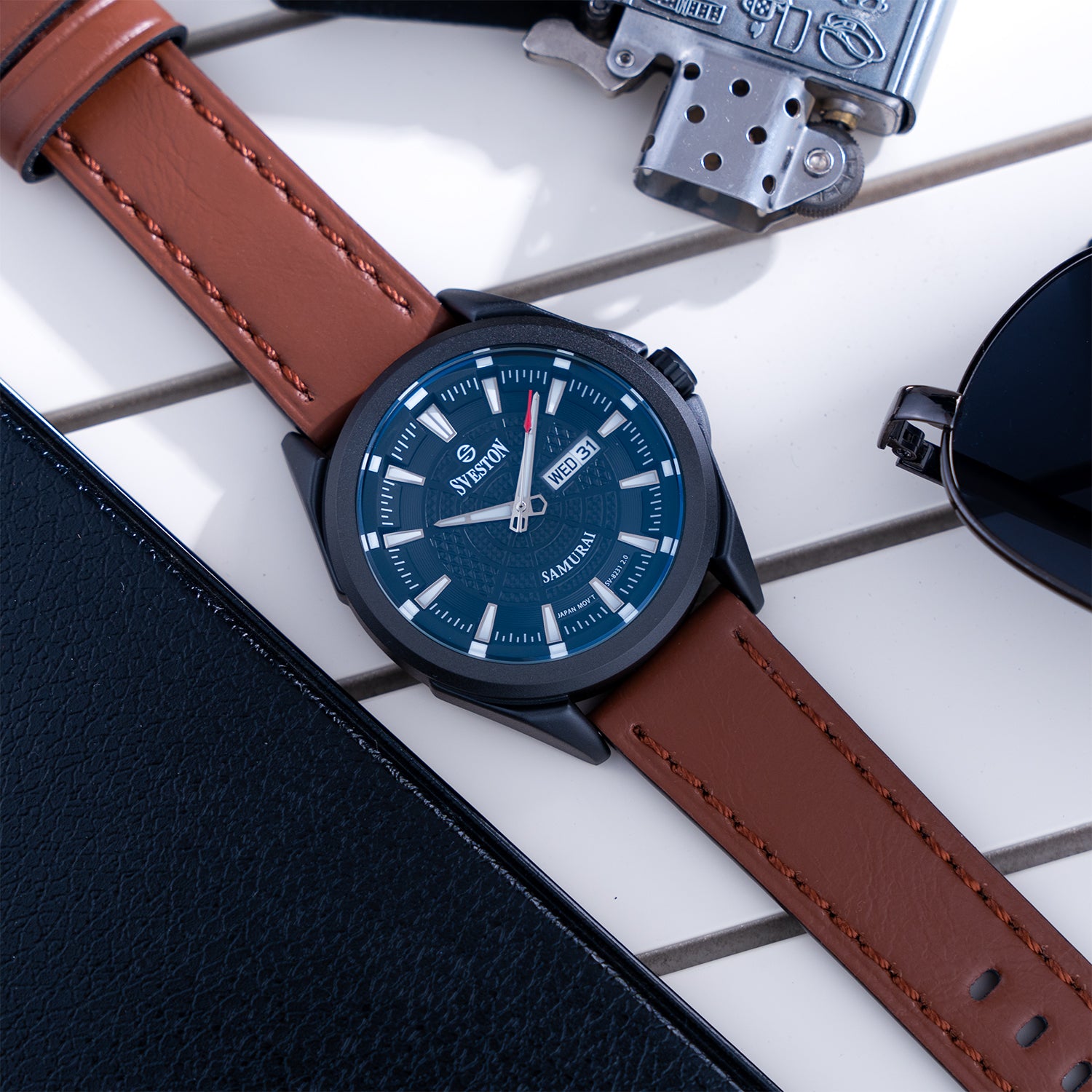 Samurai-a men's watch made with Japanese Quartz movement. Its 40mm case size and 49mm lug-to-lug distance offer a perfect fit for any wrist, while its lightweight design at 80 grams makes it comfortable to wear all day. With 3ATM water resistance, this watch is not only stylish but functional too