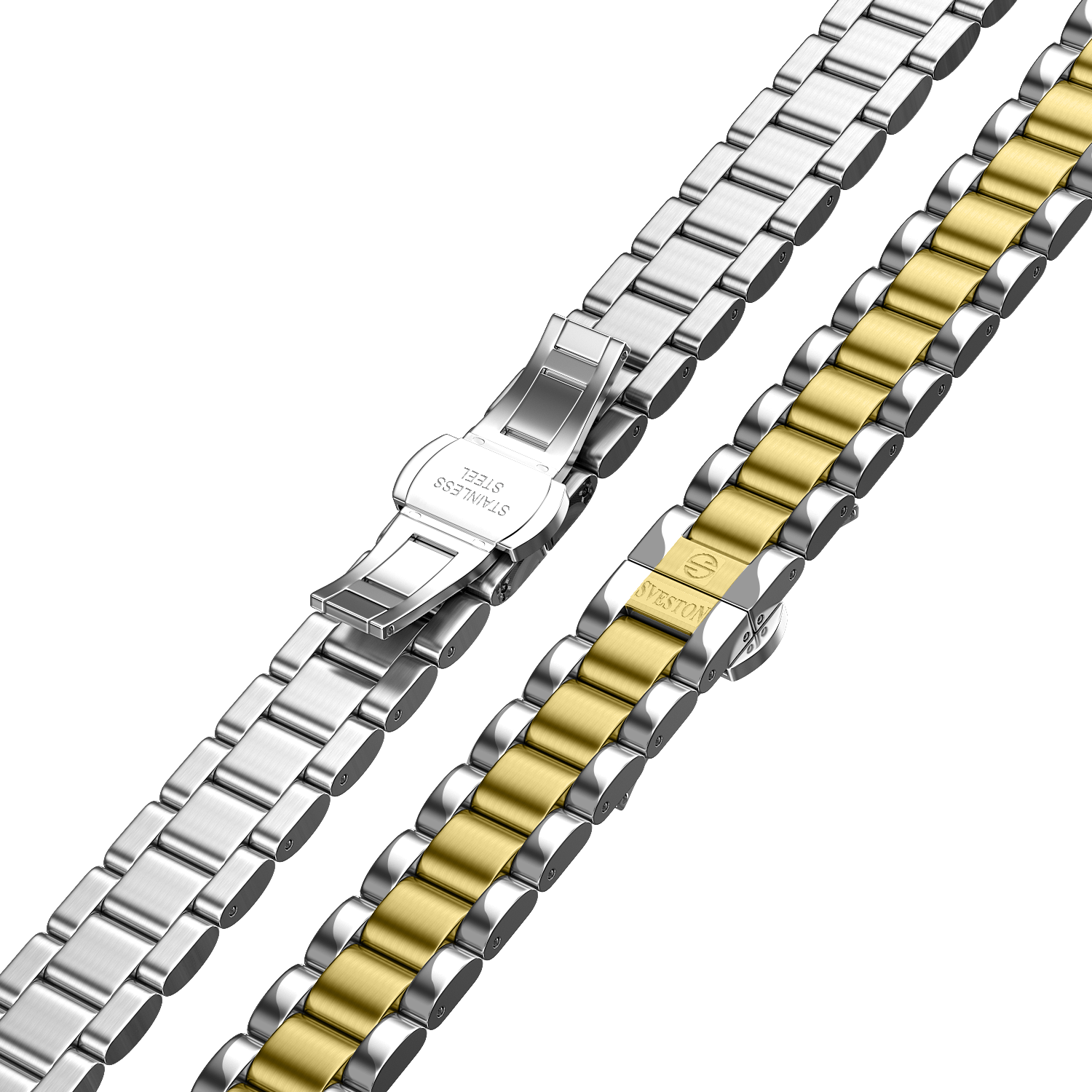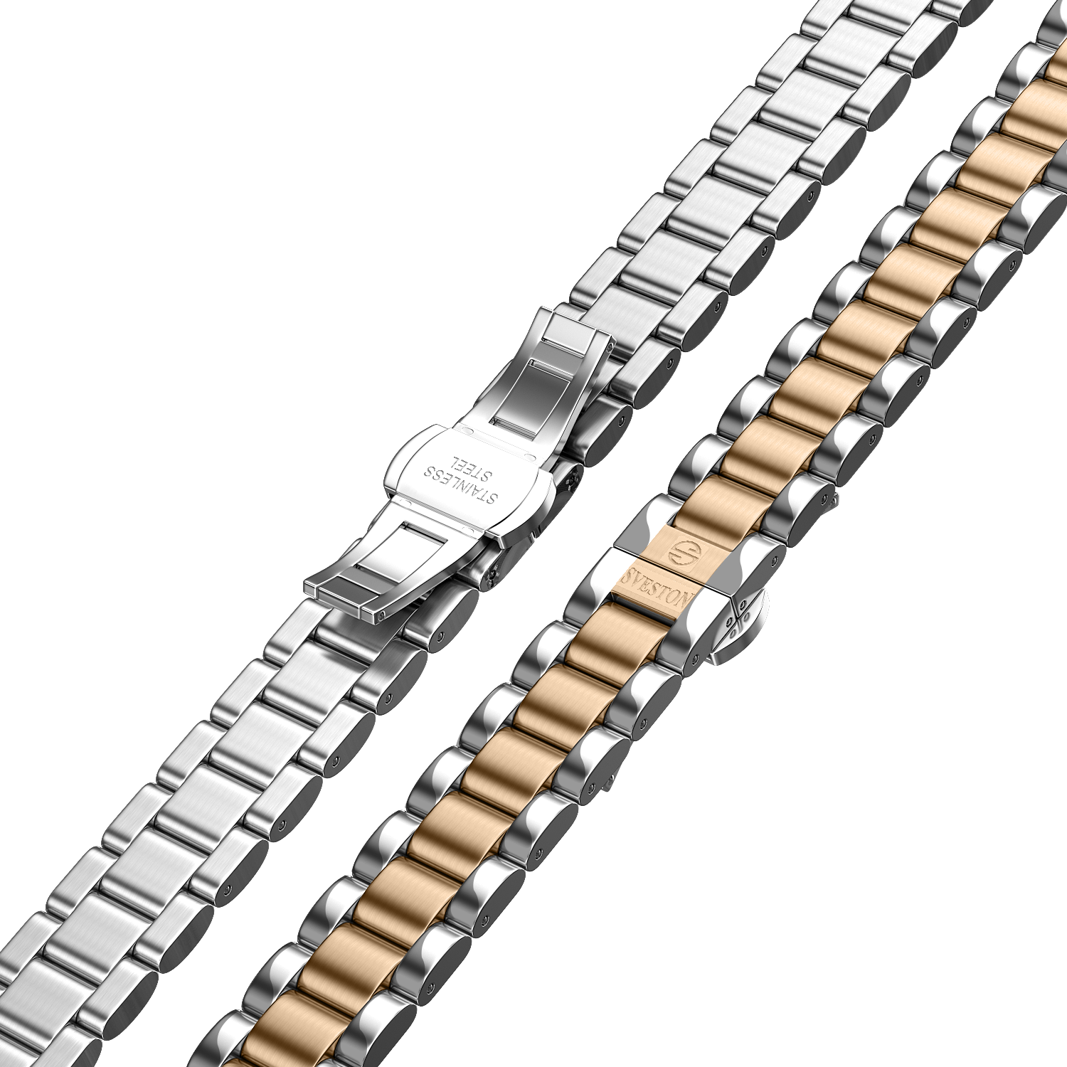 A 29mm round dial enriched with a subtle textured finish, set with slender dauphine-style hands, refined indices, and a discreet date window. Encircled by a polished bezel adorned with crystal embellishments, the circular case flows seamlessly into a solid steel case back.